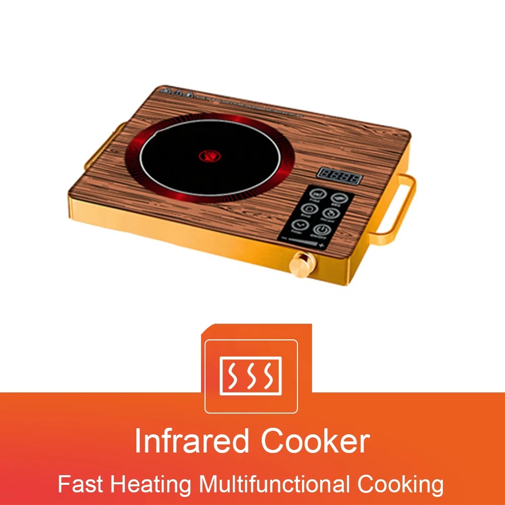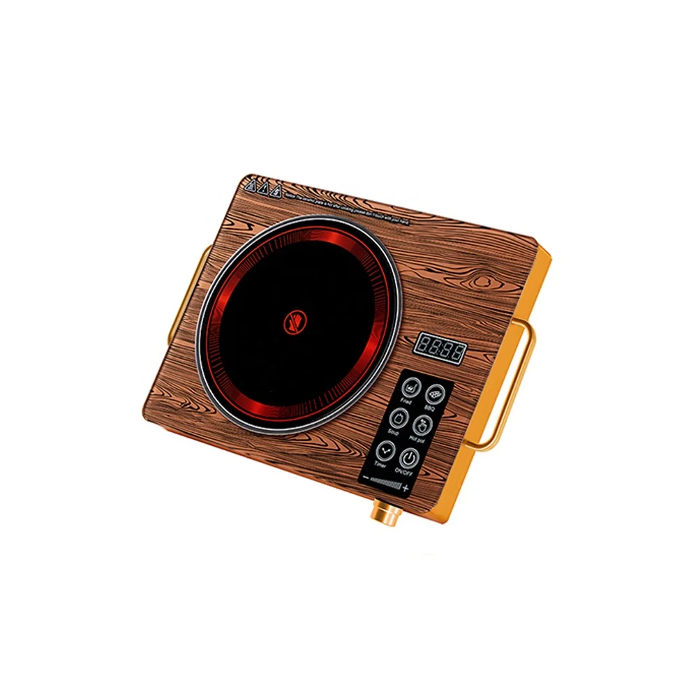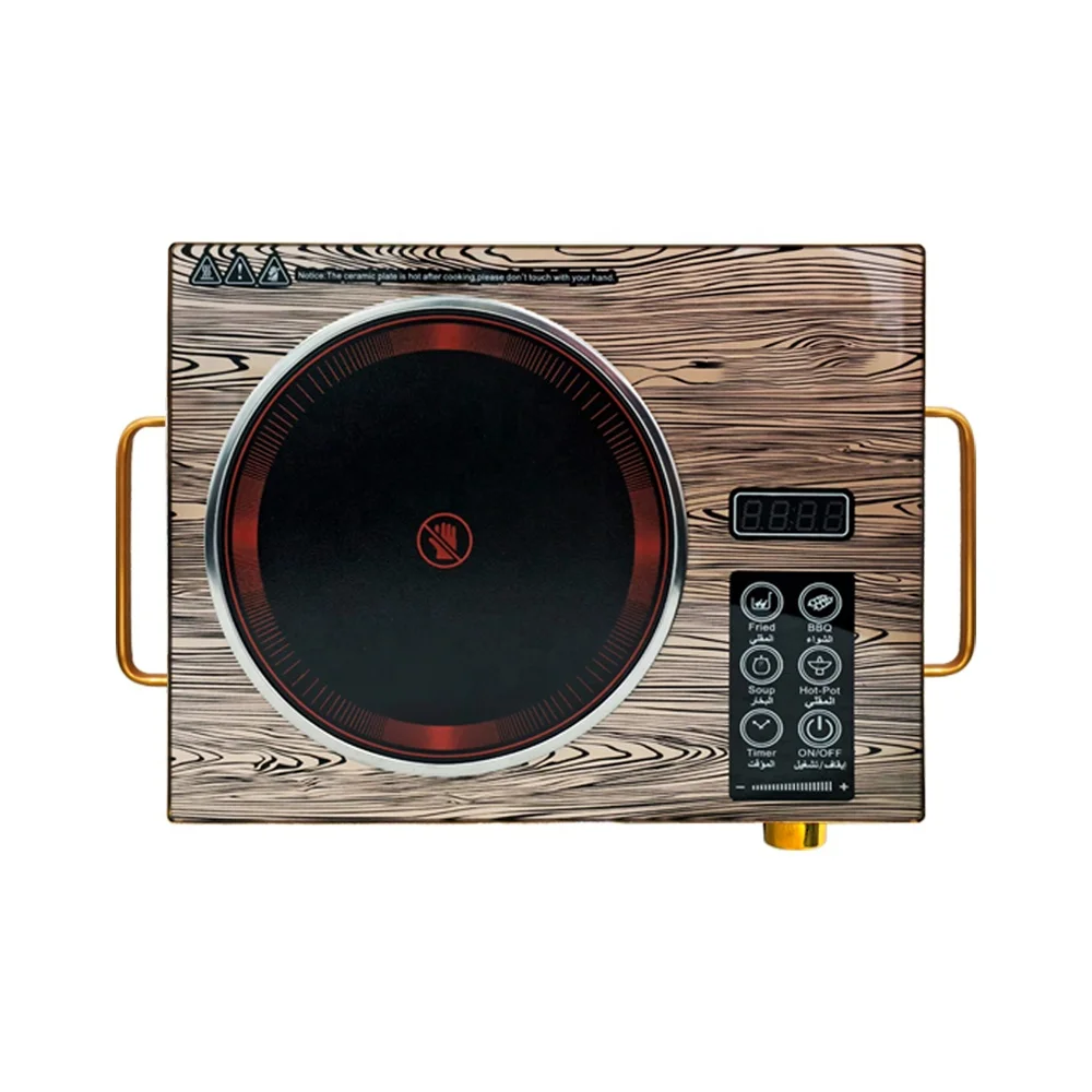 Featuring a stylish wood-grain design with golden metal handles, this cooktop not only adds an elegant touch to your kitchen but also ensures easy portability. The intuitive control panel with a digital display allows for precise temperature adjustment (ranging from 100℃ to 600℃) and timer setting, enabling you to master various cooking techniques like stir-frying, simmering, boiling, and even tea brewing with absolute ease.