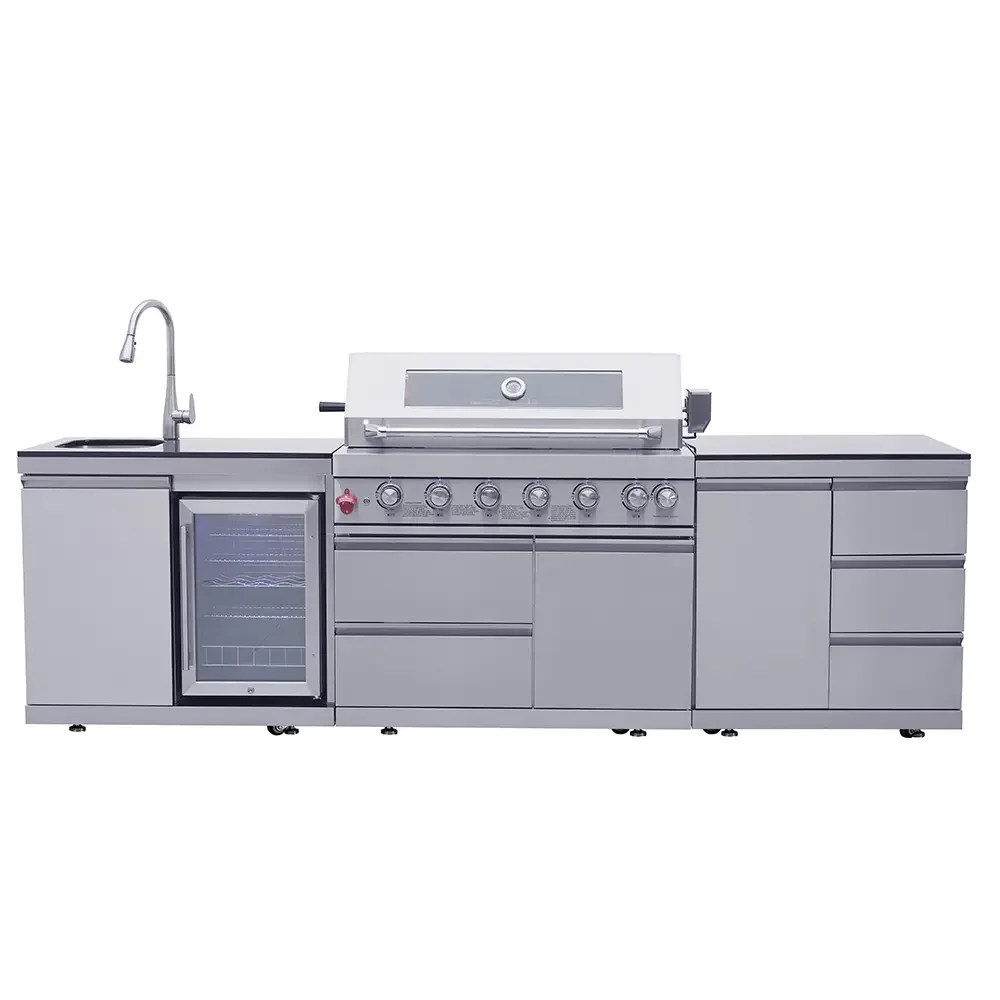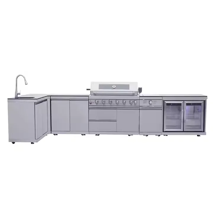 2.Integrated Functionality: Combines a gas grill, side burner, built-in refrigerator, and sink in one L-shaped layout, eliminating the need for separate outdoor appliances.